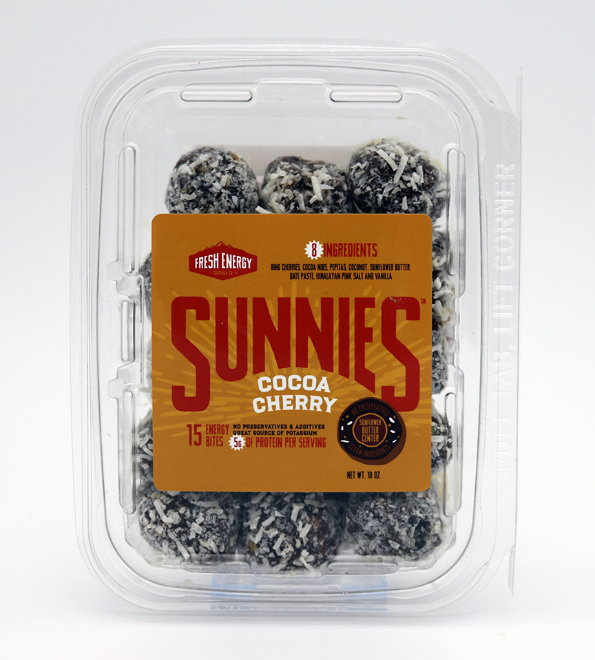 Sunnies is full of proteins, fibers, vitamins, and naturally occurring sugars from our natural ingredients: Bing cherries, cocoa nibs, pepitas, sunflower seed butter, coconut, date paste, Himalayan pink salt, and vanilla extract.