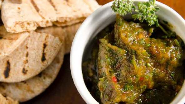 Serves: 4 Wine Pairing: Dry Riesling, Sauvignon Blanc Ingredients 2 cup Medjool dates, pitted 2-3 Jalapeno chiles, seeded and de-ribbed 1 Poblano chile ½ bunch parsley ½ bunch green onion 1 T. fresh thyme Kosher salt, to taste Freshly ground black pepper, to taste ½ cup hot water, to thin Directions Place all